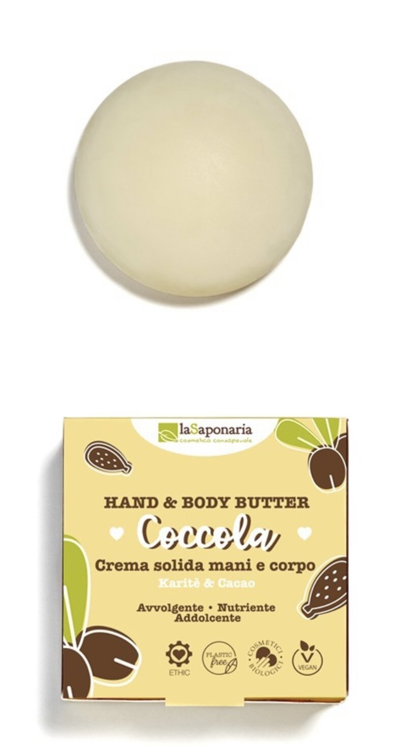 Una crema solida dal profumo dolce e vanigliato che regala positività e buon umore, scivola dolcemente sulla pelle e si scioglie con il suo calore per avvolgerti nel suo morbidissimo abbraccio. È un perfetto trattamento idratante quotidiano o una coccola avvolgente dopo la doccia per una pelle luminosa, morbidissima e deliziosamente profumata. Il formato concentrato e compatto rende Coccola ideale per essere infilata in valigia o nel borsone della palestra e nutrire la pelle anche fuori casa! Un burro corpo solido che si prende cura della tua pelle e del nostro Mondo!