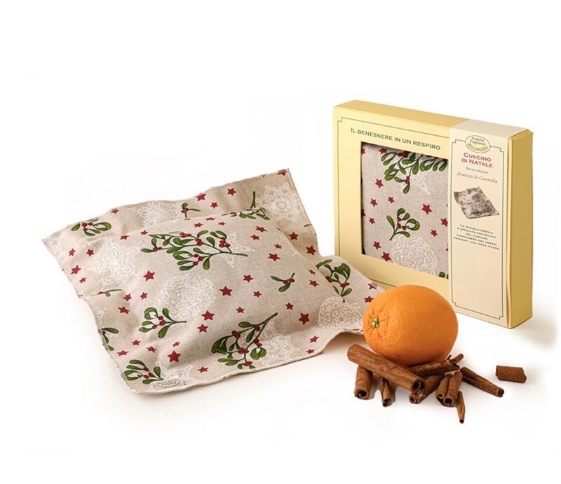 Il Cuscino è riempito con scorze d’Arancia, tranci di Cannella, pula di Grano saraceno e fragranza di Arancio & Cannella.