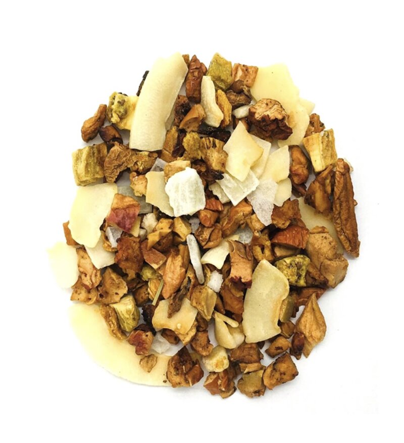 Infuso con cocco ed ananas. Preziose scagliette di cocco color avorio avvolgono in un tenero abbraccio pezzi di mela ed ananas. Una coccola esotica che riempie di gioia e dolcezza.