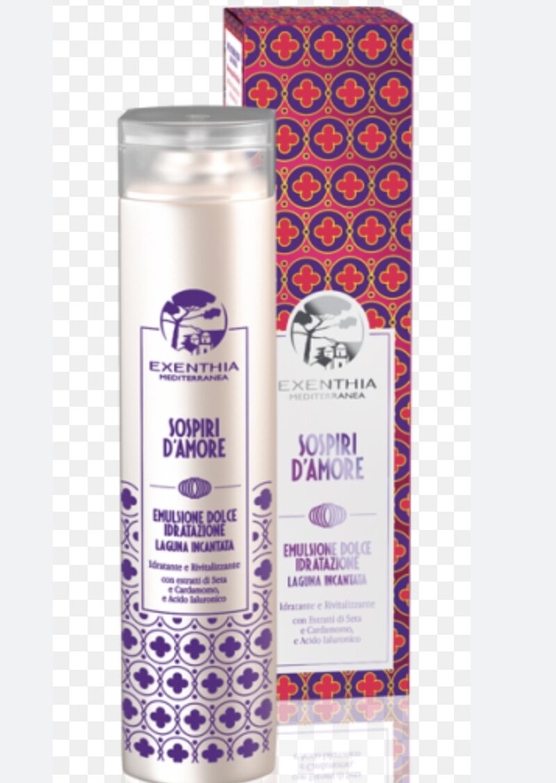 L'Emulsione Dolce Idratazione Laguna Incantata della linea sospiri d'amore Oficine Cleman Exenthia è Idratante e Rivitalizzante con estratti di Seta e Cardamomo, e Acido Ialuronico. Un'emulsione fluida e leggera, per ritrovare l'idratazione ottimale subito dopo la doccia. Contiene estratti di Seta e Acido Ialuronico dalle proprietà idratanti ed estratto di Cardamomo ad azione energizzante.