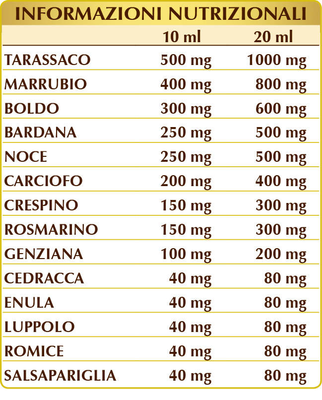 Acqua pura, alcool etilico (Alcoolvis®= Alcool purificato col metodo inventato dal Dott. Martino Giorgini), tarassaco (Taraxacum officinale) radici E.I.L., marrubio (Marrubium vulgare) erba con fiori E.I.L., boldo (Peumus boldus) foglie E.I.L., bardana (Arctium lappa) erba e radici fresche E.I.L., noce(Juglans regia) frutti freschi immaturi (verdi) E.I.L., carciofo (Cynara scolymus) foglie E.I.L., crespino (Berberis vulgaris) cortecce delle radici E.I.L., rosmarino (Rosmarinus officinalis) foglie E.I.L., genziana (Gentiana lutea) radici E.I.L., cedracca o spaccapietra (Ceterach officinarum) foglie E.I.L., enula (Inula helenium) radici E.I.L., luppolo (Humulus lupulus) strobili (fiori femminili) E.I.L., romice (Rumex crispus) radici E.I.L., salsapariglia (Smilax medica) radici E.I.L.; edulcoranti di origine naturale: glicosidi steviolici e taumatina.