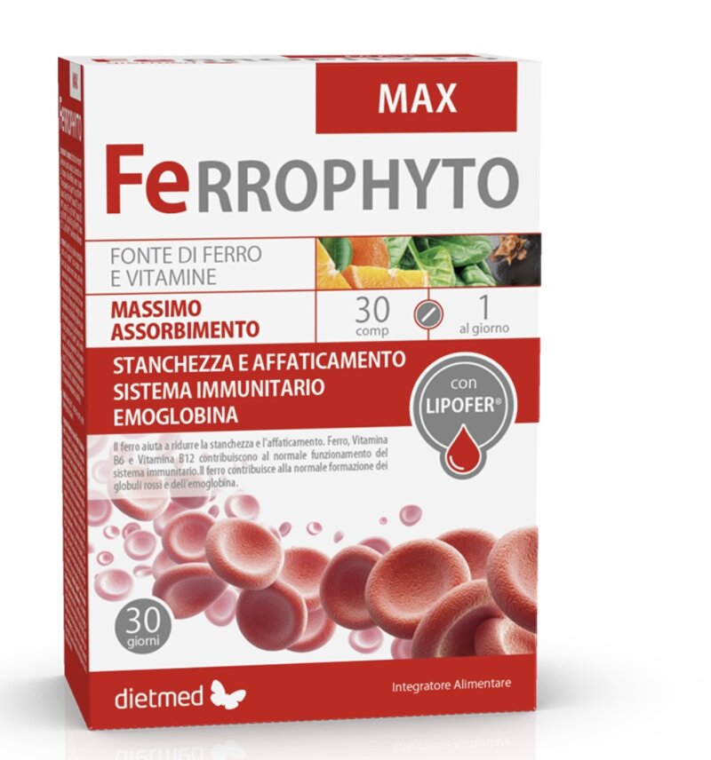 1 compressa: Estratto secco Ferrophyto® (Alghe Marine, Equiseto, Gramigna, Ortica, Finocchio, Arancia, Piantaggine, Achillea Millefoglie, Ginepro e Spinaci) 378 mg (equivalente), Ferro (Lipofer®) 14 mg (100% VNR*), Vitamina C 80 mg (100% VNR*), Vitamina B1 0,55 mg (50% VNR*), Vitamina B2 0,7 mg (50% VNR*), Vitamina B6 0,7 mg (50% VNR*), Acido folico 100 µg (50% VNR*), Vitamina B12 1,25 µg (50% VNR*).