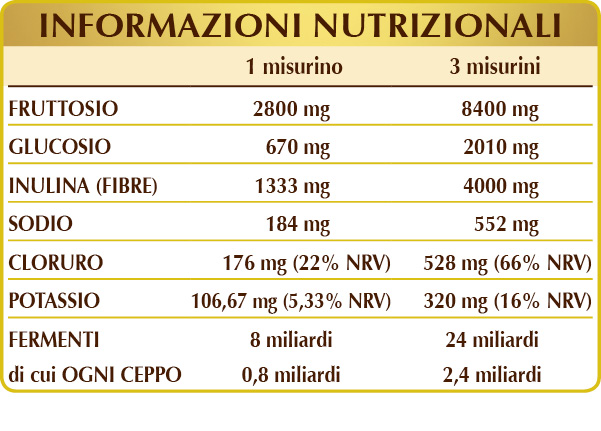 Fruttosio, cicoria (Cichorium intybus) radici estratto secco (titolato al 90% in inulina), yogurt scremato, glucosio (destrosio), maltodestrine da mais o riso, sodio citrato, potassio cloruro, sodio cloruro (sale marino), aroma caramello, miscela di fermenti lattici (titolata al 10% in ognuno dei seguenti ceppi ATCC: Bifidobacterium bifidum SD5215, breve SD5206, lactis SD5219; Lactobacillus acidophilus SD5212, brevis SD5214, bulgaricus SD5589, casei SD5213, paracasei SD5275, plantarum SD5209, rhamnosusSD5217).