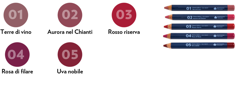 Cere e burri vegetali uniti ad olio di vinaccioli bio toscano svolgono una funzione emolliente-idratante, rendendo le labbra morbide mentre una nota di colore dall’alta modulabilità le disegna e valorizza.