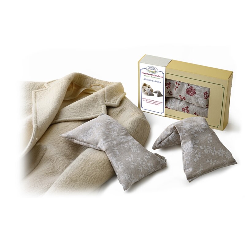 Deodorante per giacche al Muschio e Ambra: una coppia di comodi cuscinetti sagomati da inserire direttamente nelle giacche ma anche nei cappotti, golf, camicie…