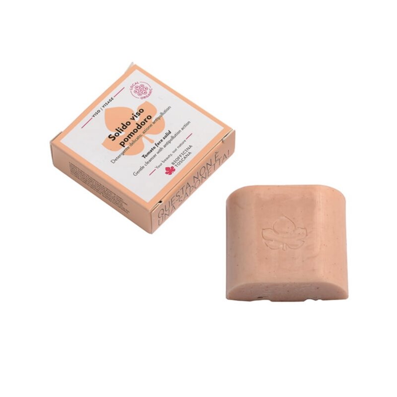 “Solido viso pomodoro” non è un semplice sapone ma un innovativo e sostenibile detergente senza acqua, plastic-free, studiato per ridurre gli sprechi ed indicato per detergere delicatamente la pelle del viso. È infatti formulato senza processo di saponificazione, come un vero e proprio detergente liquido ma senza acqua.