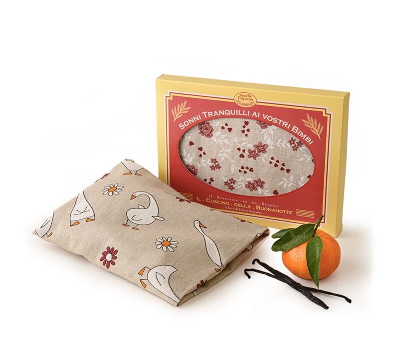 Il Cuscino è infatti preparato con una miscela completamente naturale di: Camomilla, considerata uno dei più antichi sedativi; Lavanda, da sempre utilizzata per i disturbi del sonno; Arancio dolce, la cui essenza è considerata un ottimo rimedio per far addormentare i piccoli; Luppolo, che già le antiche popolazioni nordiche usavano per riempire i cuscini allo scopo di evitare sonni agitati; Vaniglia, dall’aroma dolce e delicato, graditissimo ai bambini.