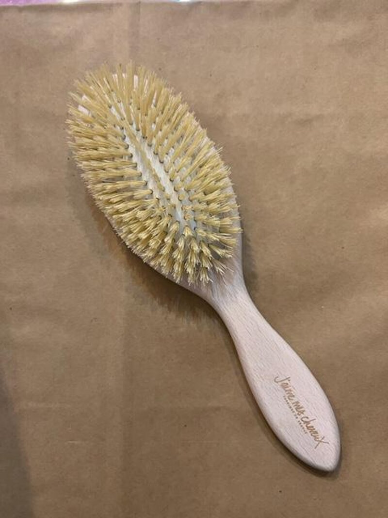 Questa spazzola per capelli naturale è realizzata in legno di faggio e seta vegetale, rendendola una spazzola vegana.